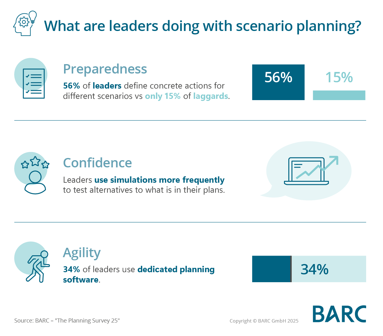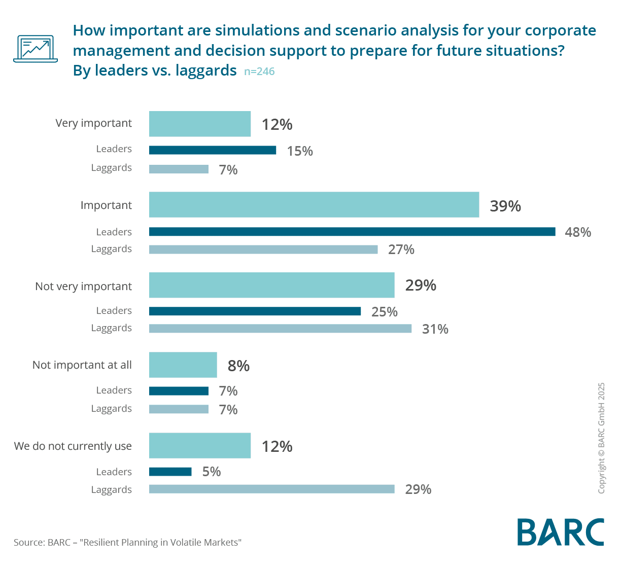 It appears that scenario planning is widely used. BARC research shows that 51% of companies surveyed regularly use simulations to navigate uncertainty. Digging a little deeper, our research also finds a discrepancy between leaders and laggards. In the Planning Survey, Leaders represent roughly the top 10% of companies based on business benefits achieved. Laggards make up approximately the bottom 10%.