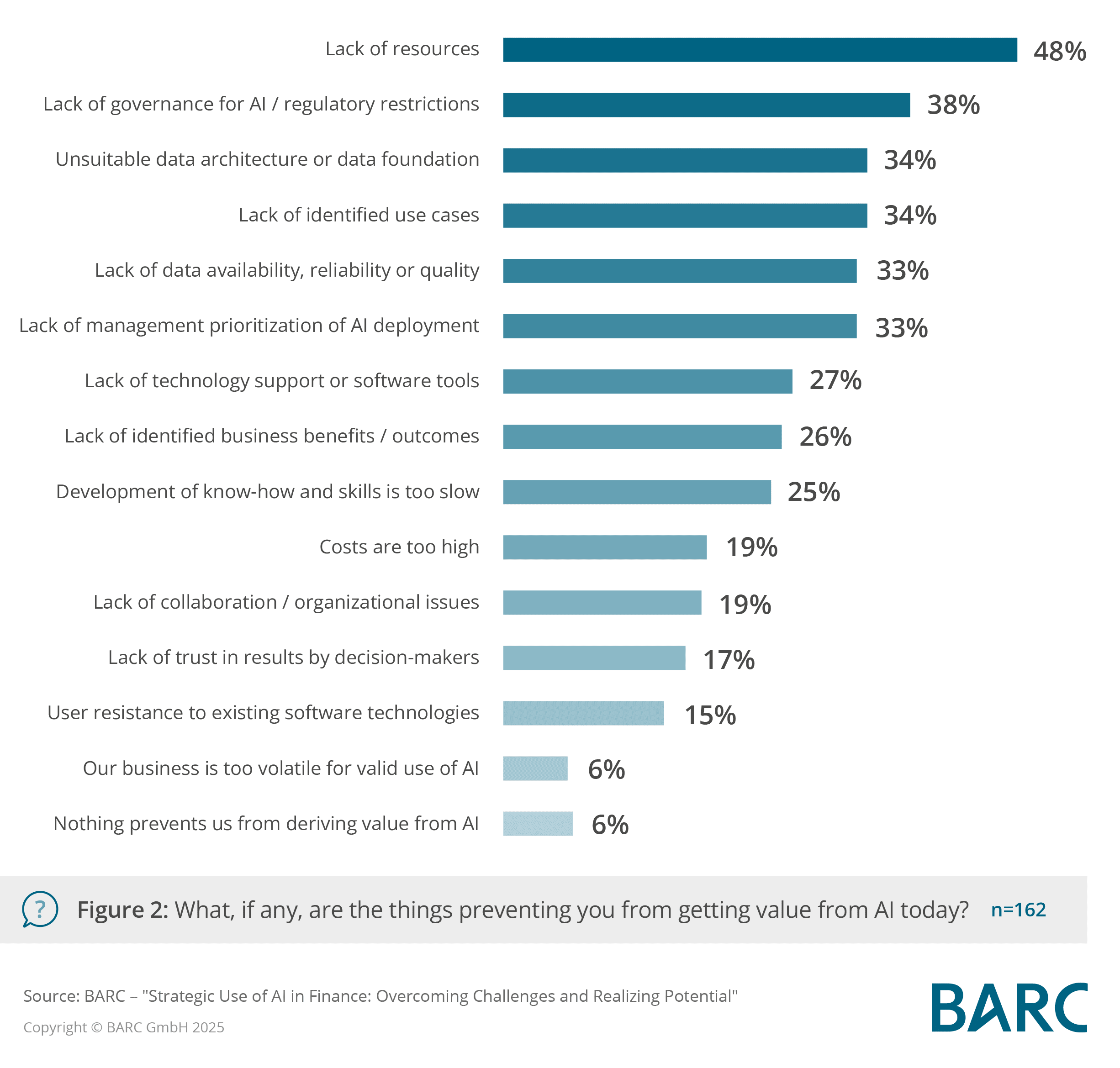 Figure 2: What, if any, are the things preventing you from getting value from AI today? (n=162) Source: Strategic Use of AI in Finance: Overcoming Challenges and Realizing Potential.