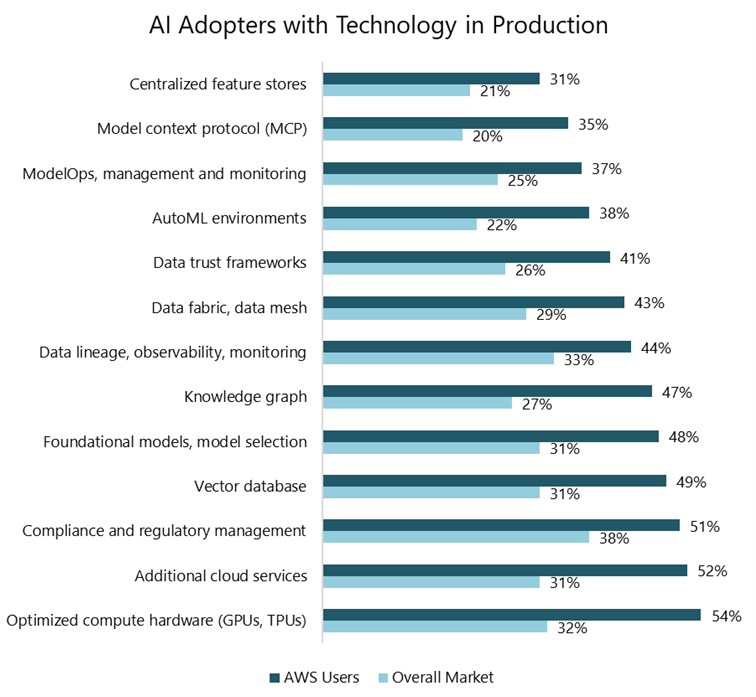 To support their endeavors, AWS users are in much higher levels of production with every type of AI-related technology compared with their peers.