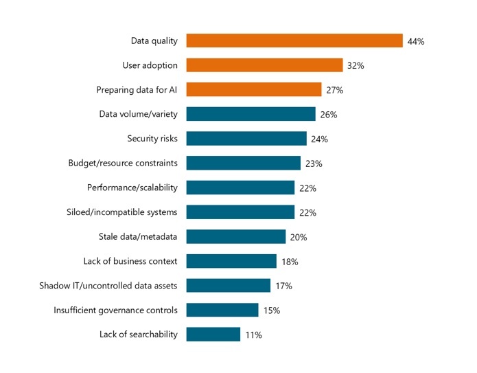- Data Quality: Duplicative, incomplete, inconsistent, stale, or invalid data continues to plague most organizations. It undermines the success of catalogs, analytics, and AI.